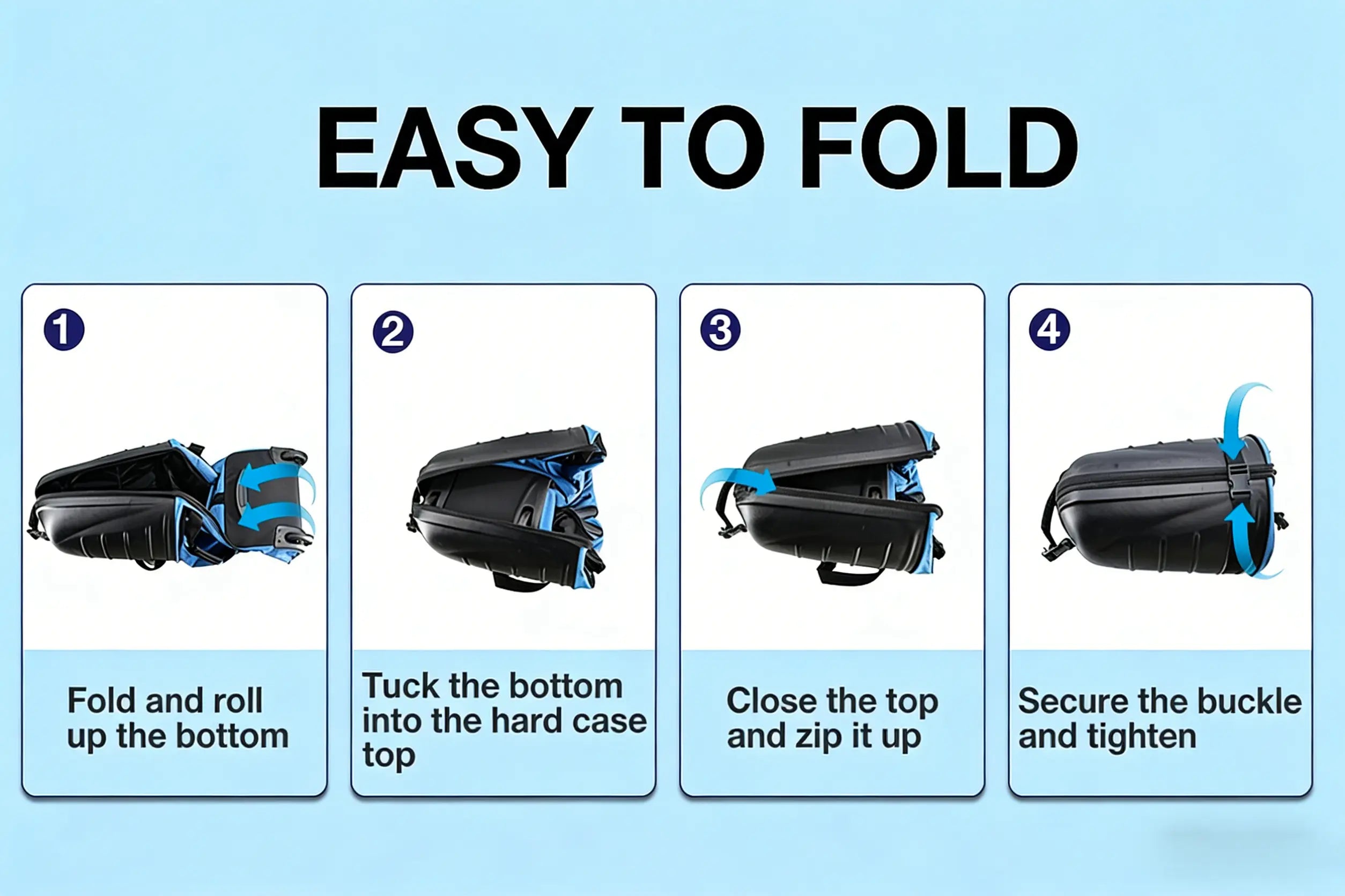 A: It's very simple, typically1-2 steps: release the latches and press to fold. The design is intuitive and requires no tools.